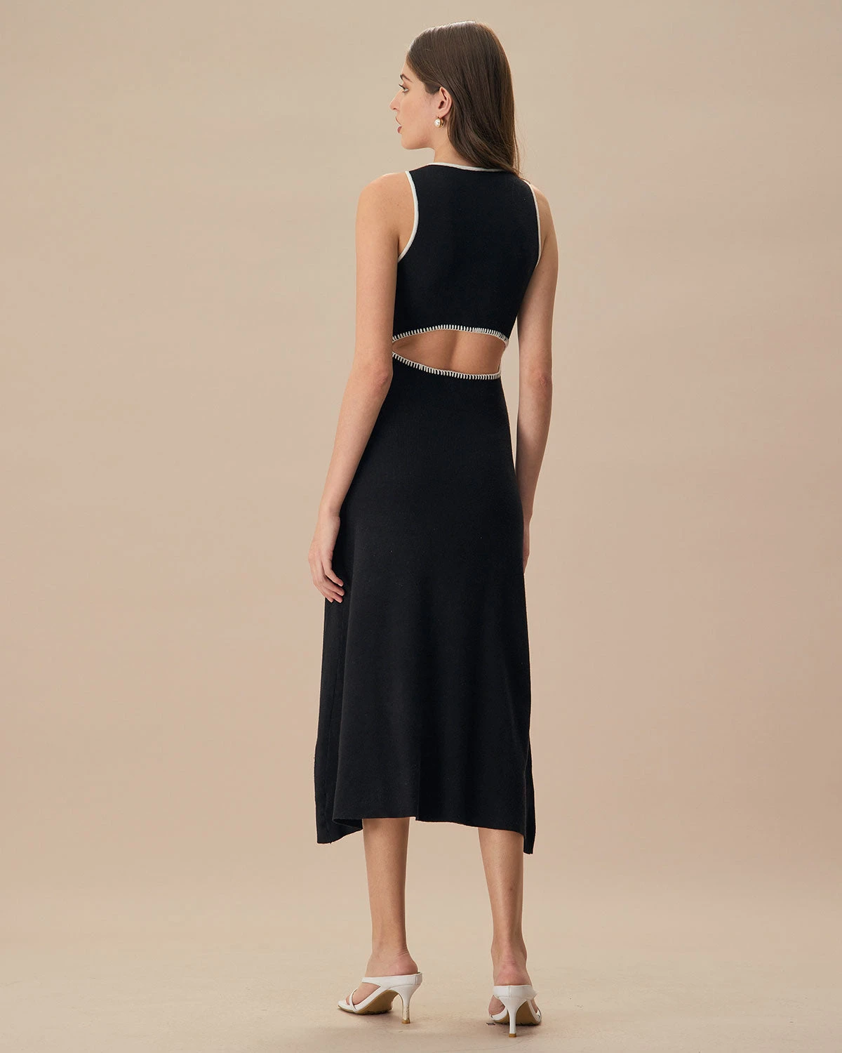 Designed with intricate cut-out details and contrasting knit patterns, this halter midi dress combines contemporary style with classic elegance. The black hue adds a touch of timeless sophistication, while the cut-out accents create a modern, eye-catching look. Perfect for evening events or upscale gatherings.