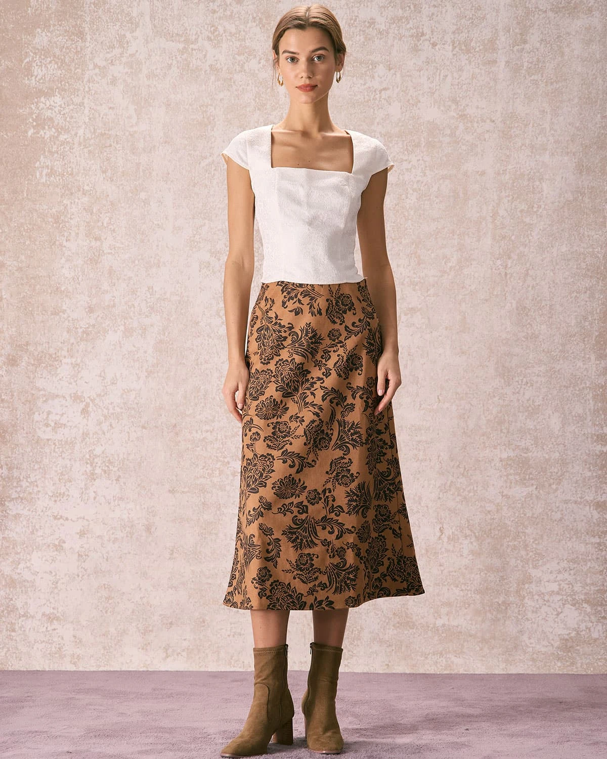 This High Waisted Skirt is a versatile piece that combines feminine style with modern comfort. The suede and floral print detail adds a touch of elegance and pairs well with a variety of tops. The zipper fly and high waisted design create a classic silhouette with a modern twist, perfect for any occasion. Whether dressed up with heels or dressed down with sneakers, this skirt is a must-have addition to any wardrobe.