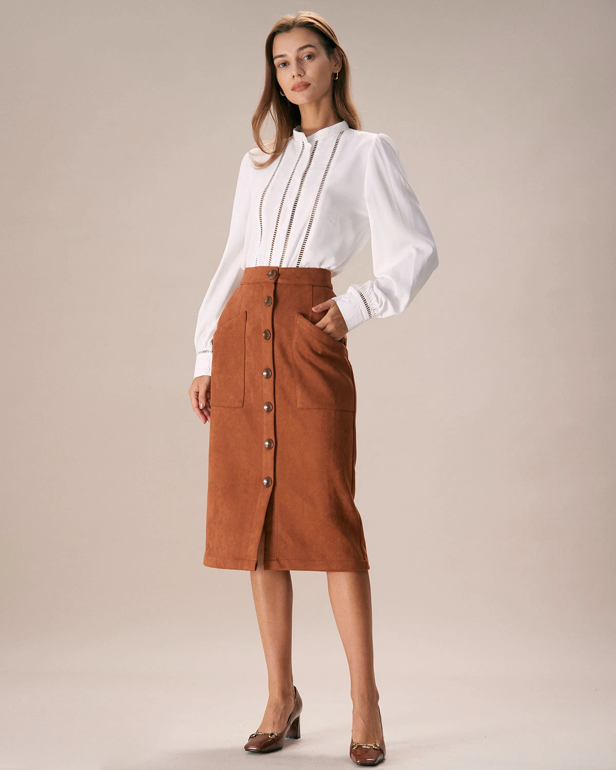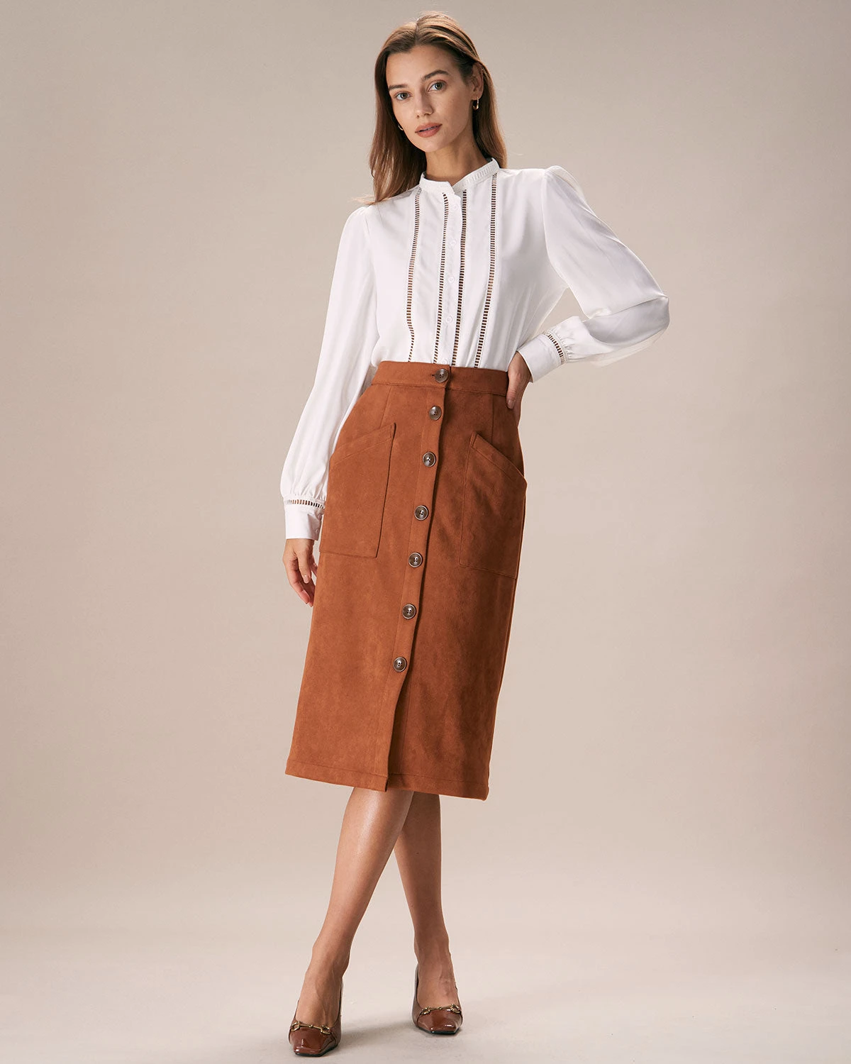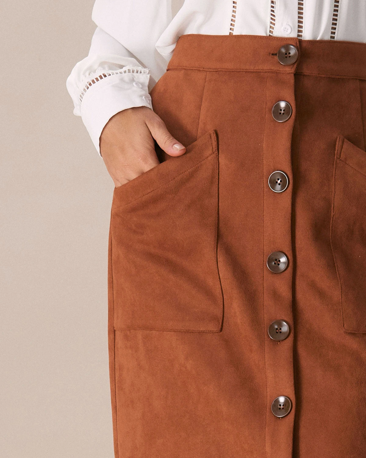 The Brown Suede Single Breasted Midi Skirt