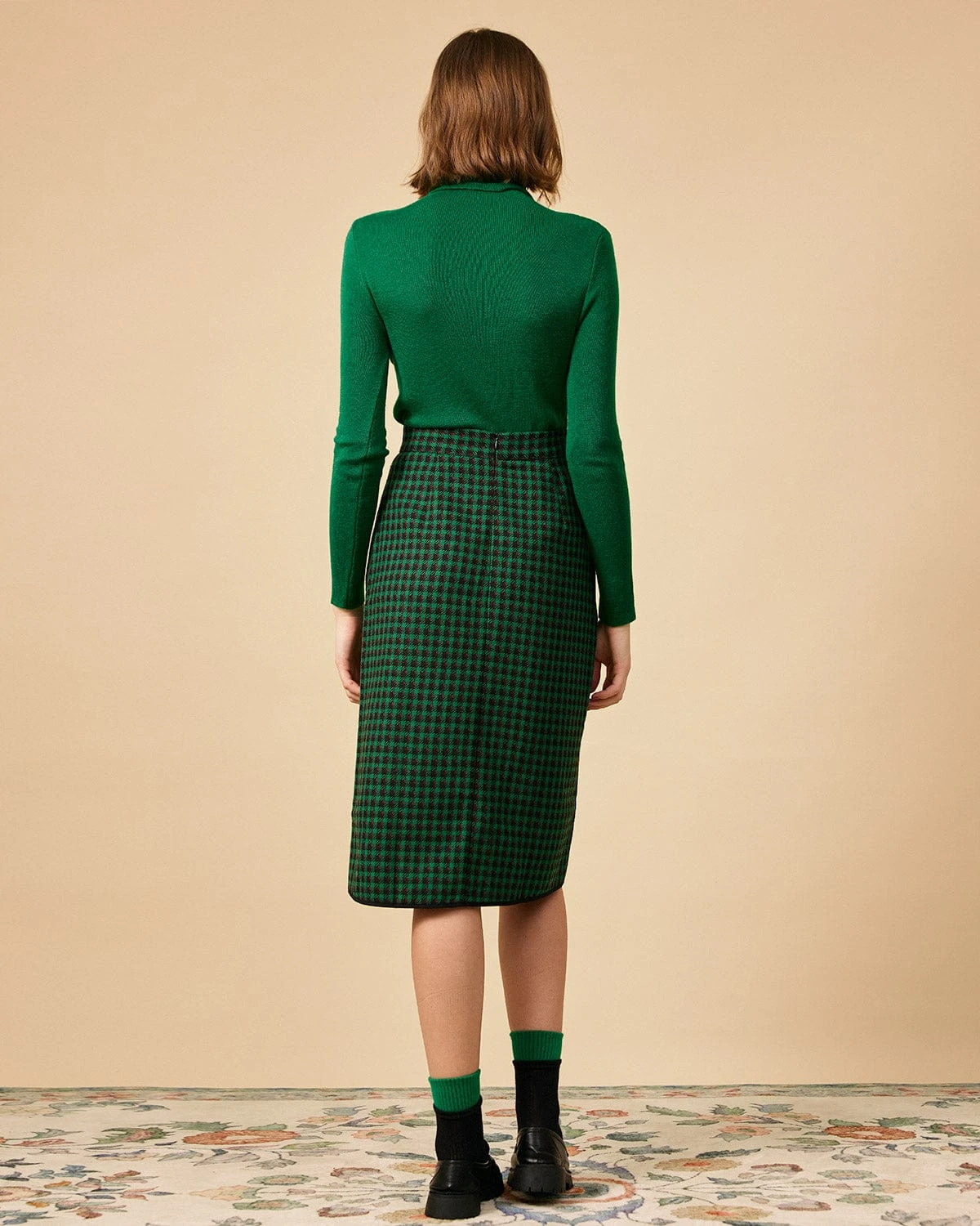 This midi skirt is a classic retro vibe that mixes the classic look of a plaid tweed skirt with a modern, chic fake button front. The high-waisted style and flattering pocket detailing make this skirt perfect for work or date nights with a pair of heels or flats.