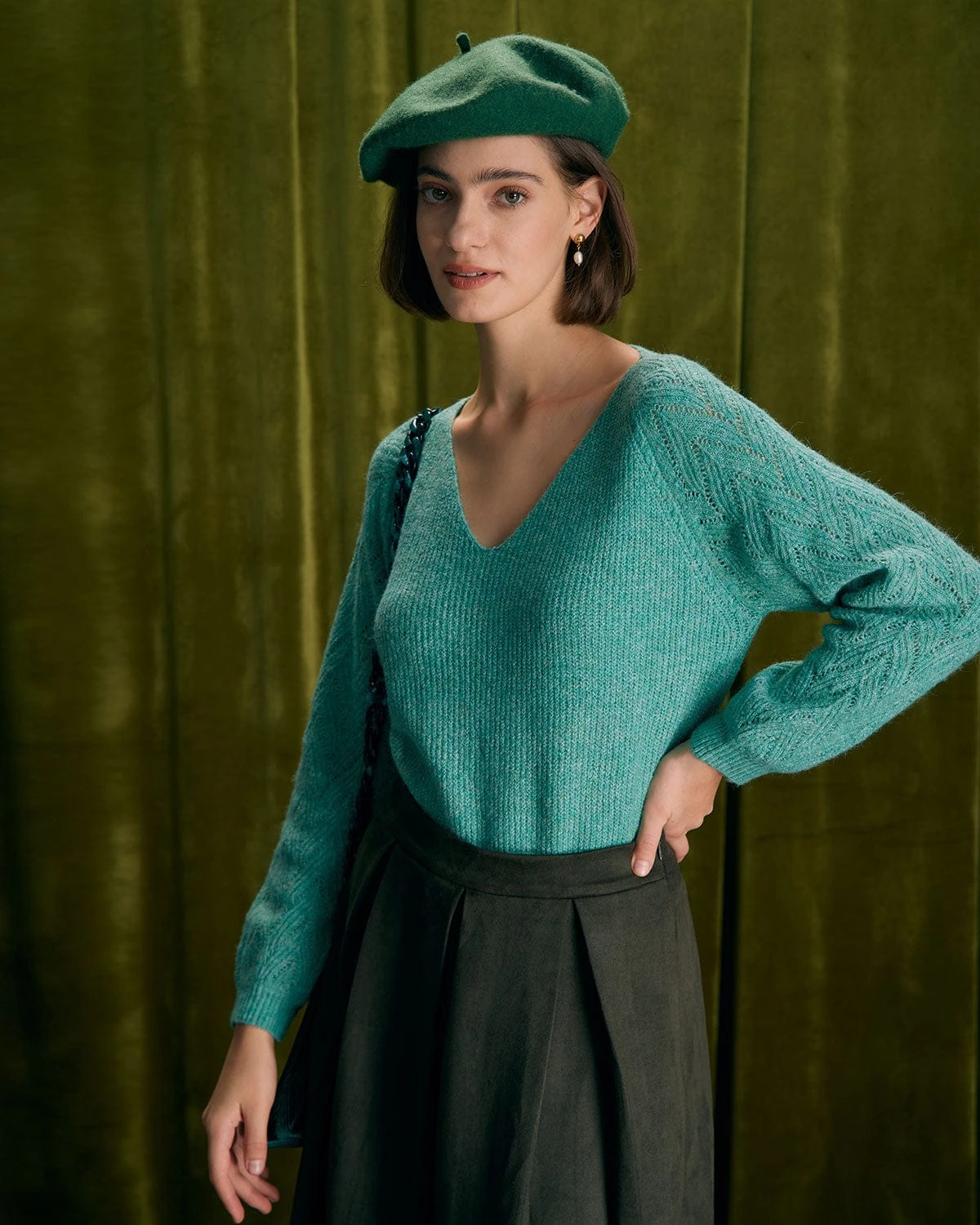 This V Neck Sweater is really a surprise Sweater. Designed in solid color and v-neck, it shows females’ strength and confidence well. Also, the pointelle and ribbed design makes it vintage, which is both practical and well-crafted. The medium stretch, raglan sleeve and regular fit follow the classic, cozy yet sophisticated. Pairing it with boots would be a good choice.