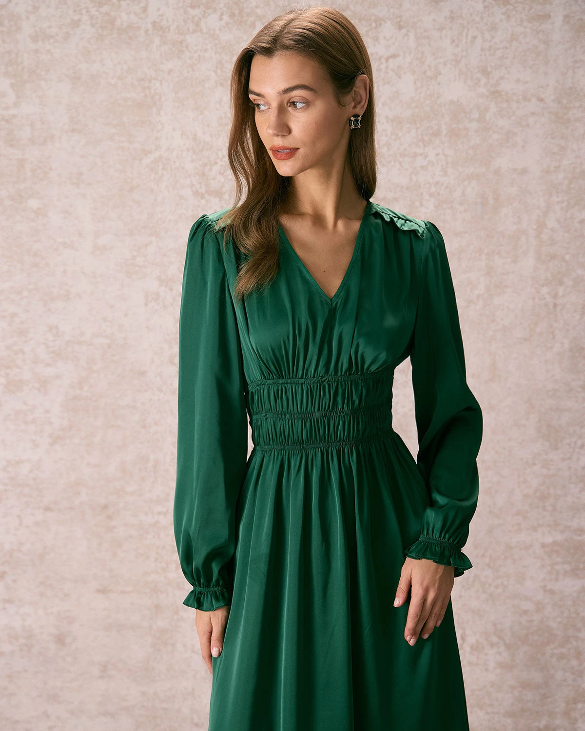 This Ruched Midi Dress is a perfect choice for any occasion. The slim fit, poet sleeve and lantern sleeve design of the dress adds movement and flow, making it easy to wear. The v-neck, satin and ruched detail adds a feminine touch and makes this dress perfect for any occasion. Whether you’re going out on a date or attending a formal event, this dress is sure to turn heads and make you feel fabulous.