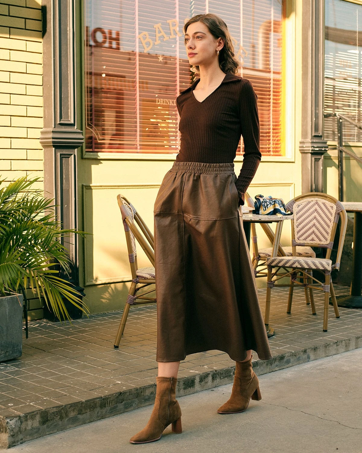 A leather skirt is a must-have in fall/winter. Its brown color is in line with fall/winter, perfectly going with knit tops. Designed in an elastic waist and regular fit, it is much more inclusive for females’ bodies compared with others. Also, its high-waisted design offers you a perfect figure ratio visually, and pockets on two sides are convenient for your hands.