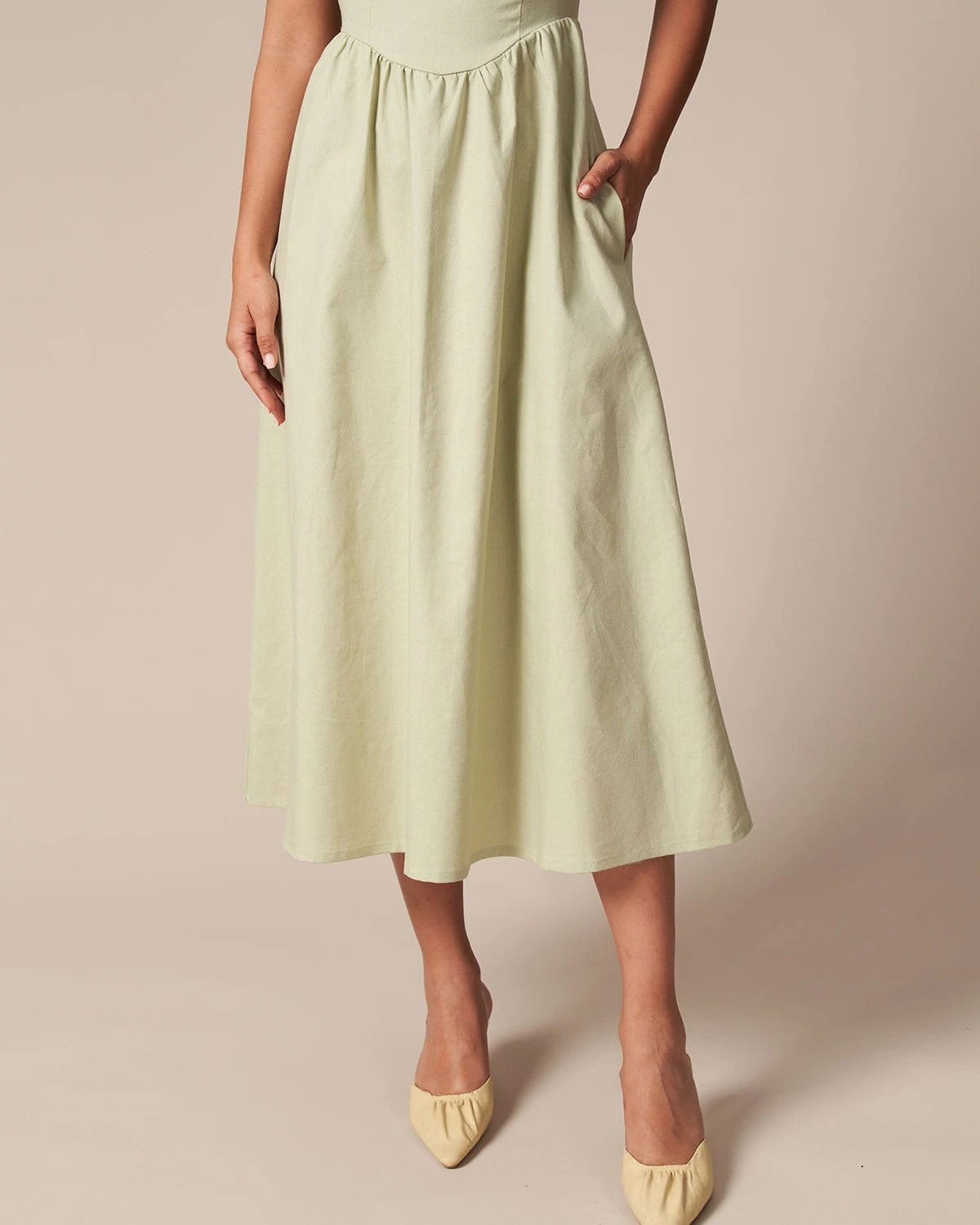 This Shirred Midi Dress is made of Cotton, Linen and Polyester. Cotton fabric features humidity balance, durability, and eco-friendly nature, feeling soft but not stiff when touching the skin. Linen is strong, naturally moth resistant, biodegradable and recyclable. Polyester is an artificial fiber that feels soft, looks lustrous, and dries fast.