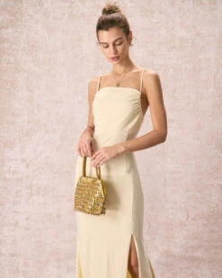 This dress features a sophisticated square neckline that enhances the décolletage, while the ruched detailing along the bodice adds a flattering and dynamic touch. Its rich navy hue offers a timeless appeal, and the midi length provides a graceful silhouette that suits various occasions.Â