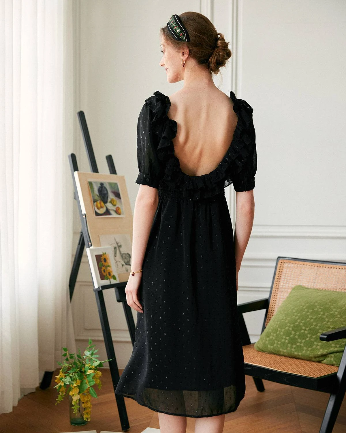 Have you ever seen so many fashion elements only involved in a dress? The U shape backless, ruffle trim, and puff sleeve design, together with black, make you noble and graceful when wearing. Additionally, the elastic waist will comfort your tummy and you will never worry about controlling your tummy laboriously for beauty for it can bring you both comfort and beauty. Certainly, the ruched design adds a shining point to this dress.