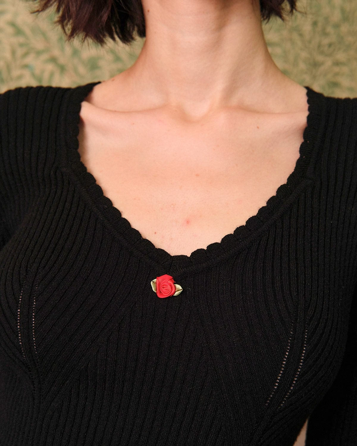 A knit top is most people’s choice in fall. Featuring solid color and slim fit design, it has a slight stretch, offering females enough coziness. The v-neck shows female beauty of maturity, while the wavy trim outlines the designer’s focus on details. Plus, the ribbed fabric makes it textured visually. Crucially, a small red floral on the neckband gives the perfect finishing touch to this knit top.
